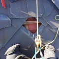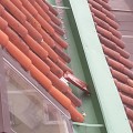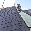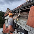 Výškové práce při opravě střechy v Praze 5 Na Václavce. Opravujeme poškozenou mansardu domu, ze které začaly padat tašky na chodník před dům. Provedli jsme nové laťování a kompletně krytinu ukotvili. Výškové práce Praha NYK