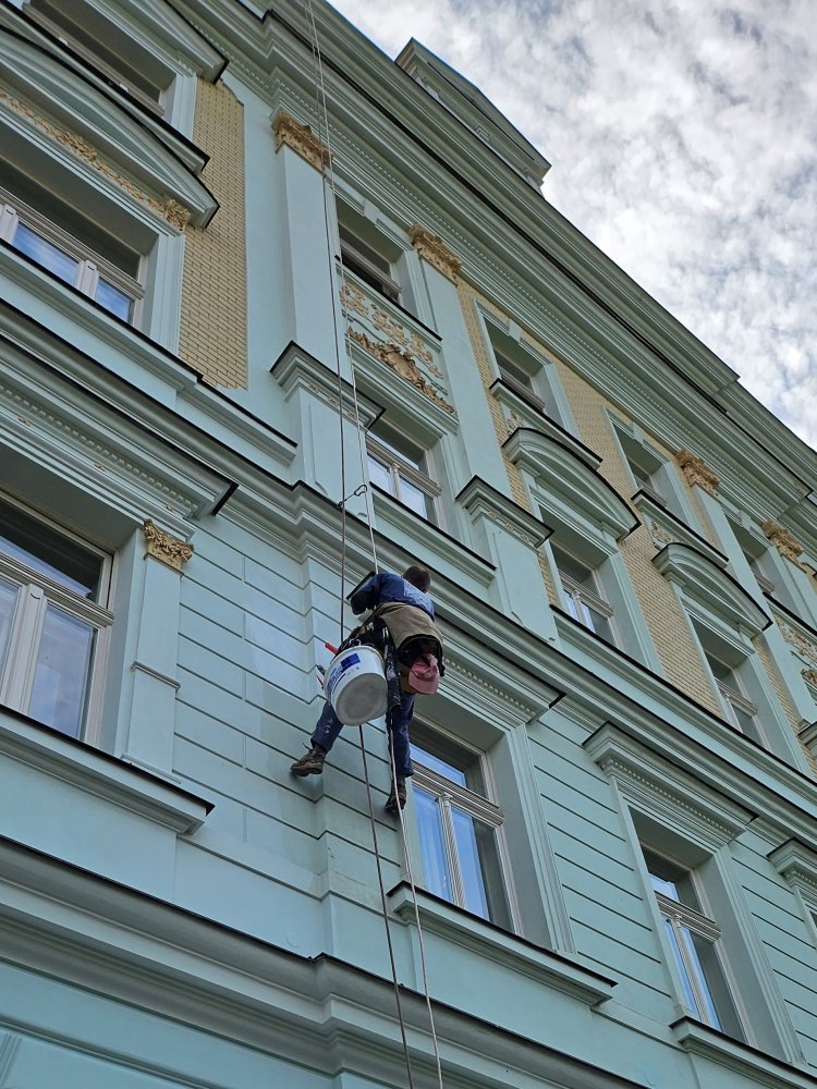Další výškové práce v Praze v ulici Belgická, Praha 2. Oprava fasády pomocí horolezecké techniky.